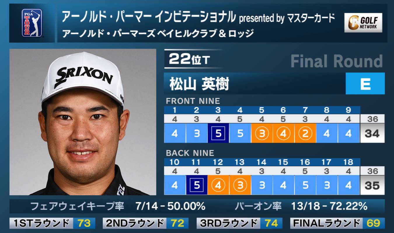 米男子ツアーのアーノルド・パーマーインビテーショナルは9日、米フロリダ州のアーノルド・パーマーズ ベイヒルクラブ&ロッジ(7,466ヤード・パー72)で最終ラウンドが行われ、松山英樹は5バーディ、2ボギーの「69」と伸ばし、通算イーブンパー22位タイとなった。