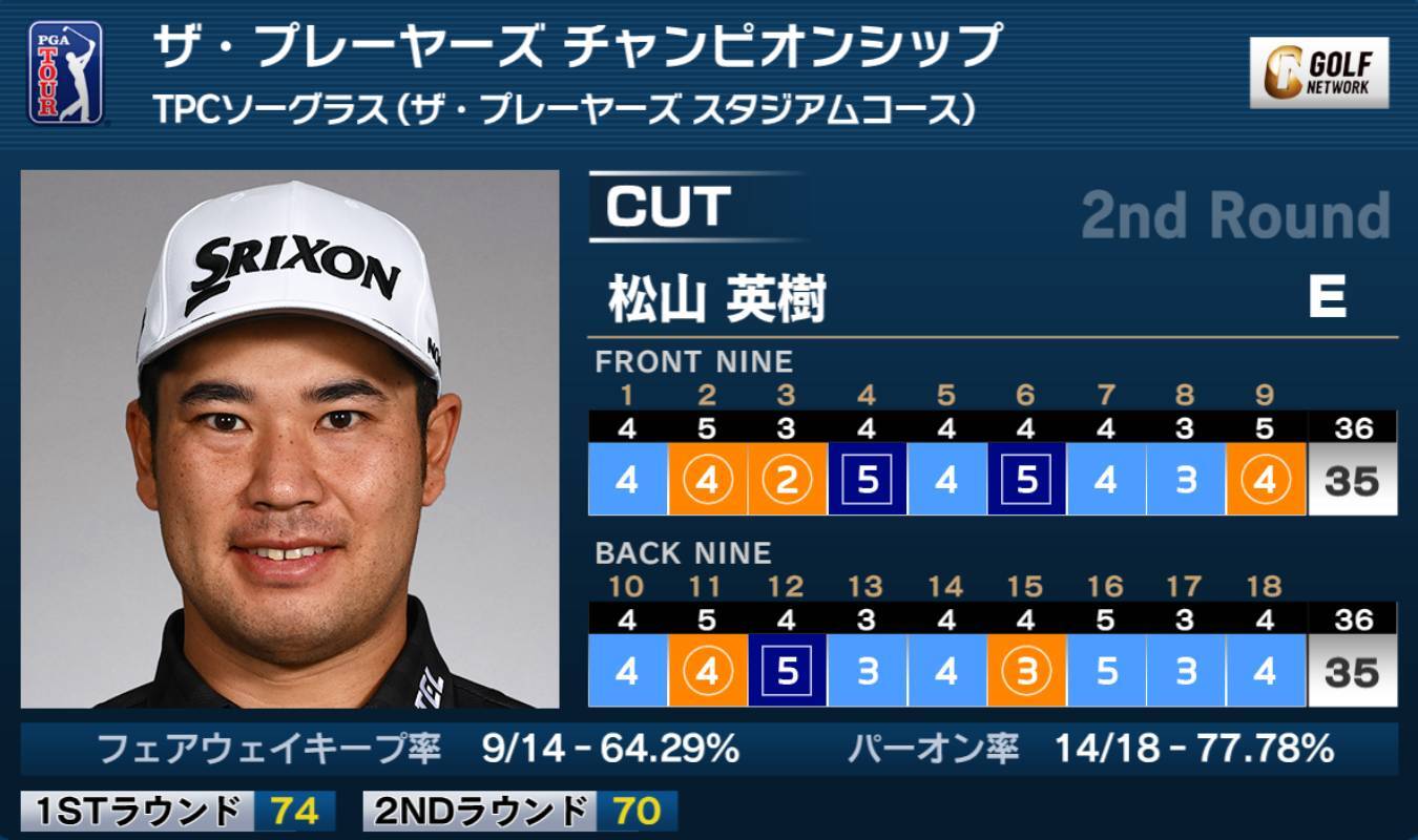 米男子ツアーのザ・プレーヤーズチャンピオンシップは14日、米フロリダ州のTPCソーグラス(7,352ヤード・パー72)で第2ラウンドが終了。松山英樹は99位タイから5バーディ、3ボギーの「70」と伸ばすも、カットラインに1打及ばず通算イーブンパー73位タイで予選落ちとなった。