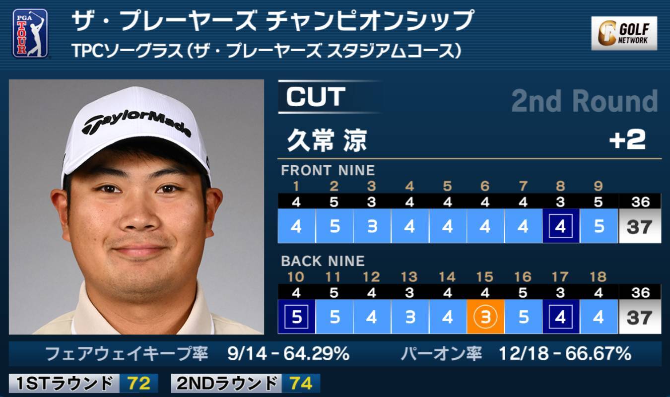 米男子ツアーのザ・プレーヤーズチャンピオンシップは14日、米フロリダ州のTPCソーグラス(7,352ヤード・パー72)で第2ラウンドが行われ、久常涼は61位タイから1バーディ、3ボギーの「74」と落とし、通算2オーバー96位タイで予選落ちとなった。