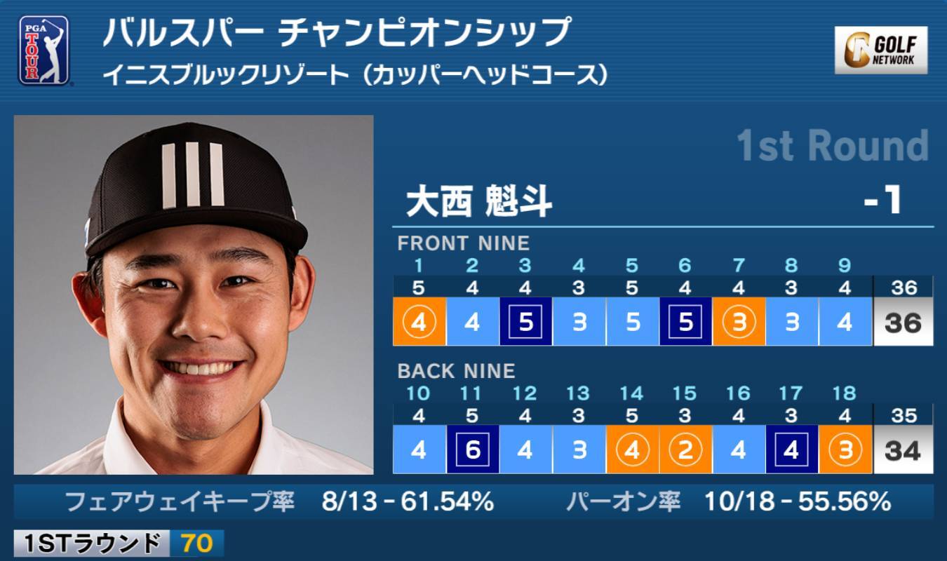 米男子ツアーのバルスパーチャンピオンシップは20日、米フロリダ州のイニスブルックリゾート(7,352ヤード・パー71)で第1ラウンドが行われ、大西魁斗は5バーディ、4ボギーの「70」を記録し、1アンダー暫定23位タイ(日没順延)となった。
