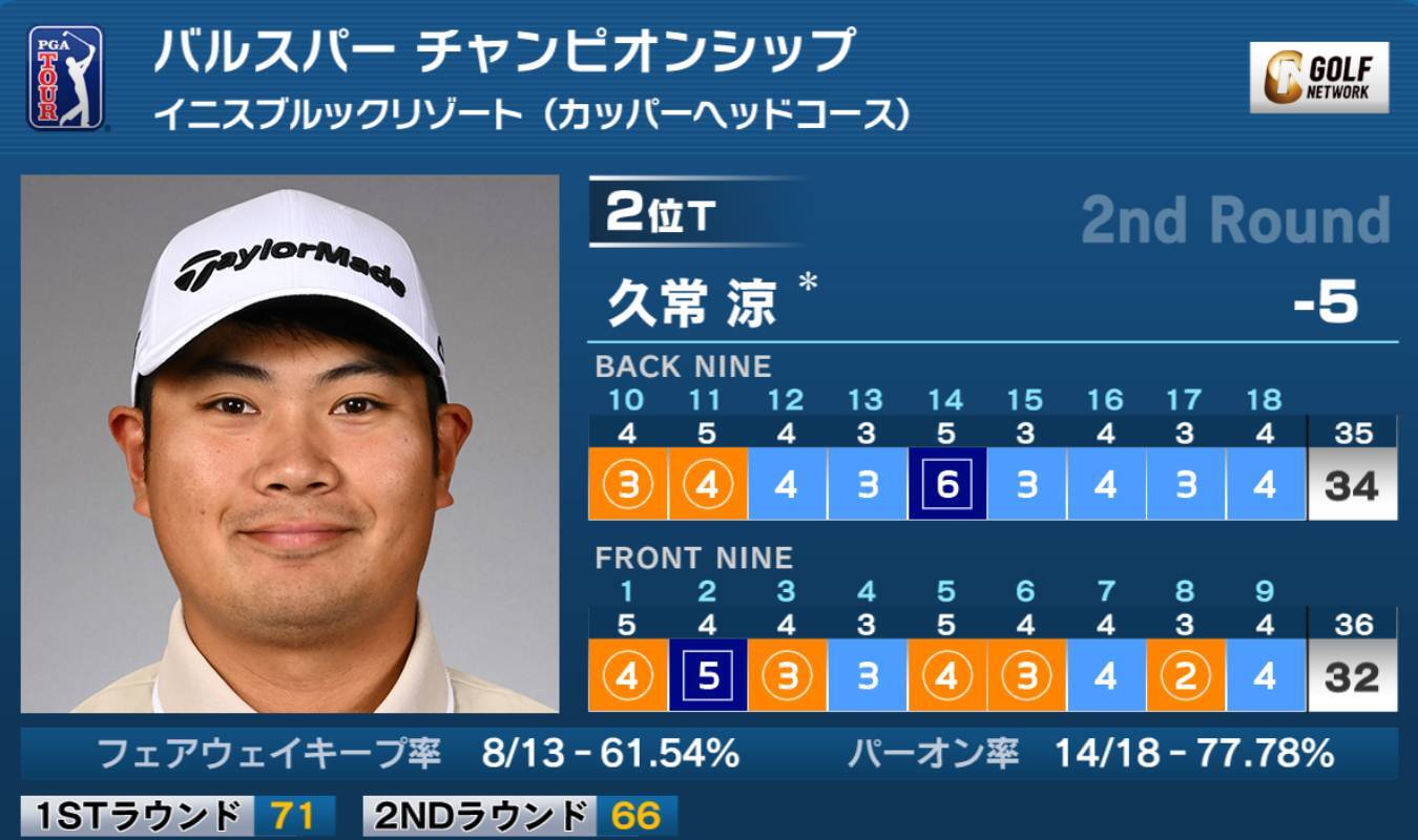 米男子ツアーのバルスパーチャンピオンシップは21日、米フロリダ州のイニスブルックリゾート(7,352ヤード・パー71)で第2ラウンドが行われ、久常涼が7バーディ、2ボギーの「66」を記録し、トップと1打差の通算5アンダー2位タイに浮上した。