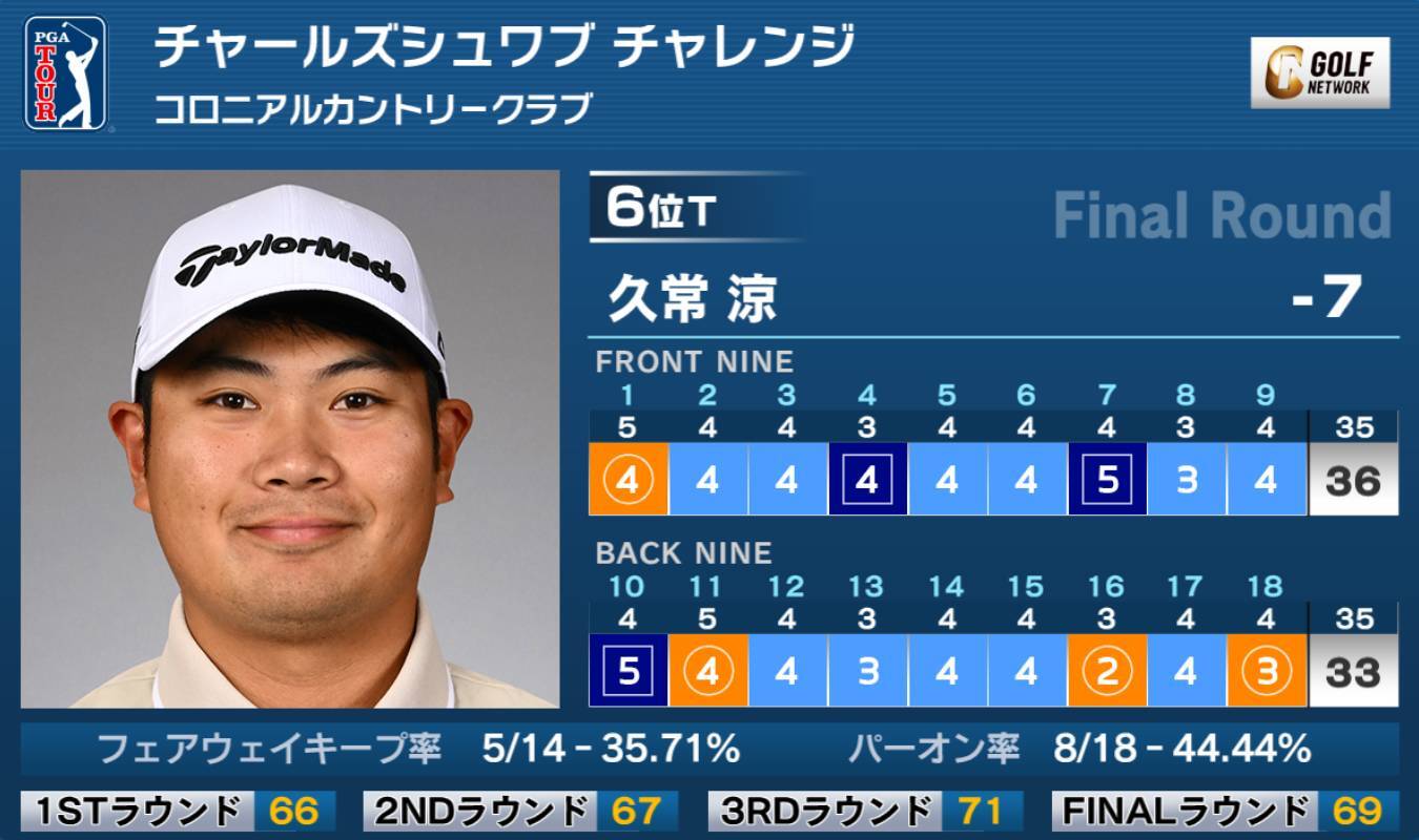 米男子ツアーのチャールズシュワブチャレンジは25日、米テキサス州のコロニアルカントリークラブ(7,289ヤード・パー70)で最終ラウンドが行われ、久常涼は4バーディ、3ボギーの「69」と伸ばし、通算7アンダー6位タイで大会を終えた。