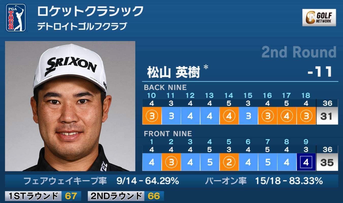 米男子ツアーのロケットクラシックは27日、ミシガン州のデトロイトゴルフクラブ ノースコース(7,370ヤード・パー72)で第2ラウンドが行われ、松山英樹が7バーディ、1ボギーの「66」で回り、通算11アンダー8位タイに浮上した。
