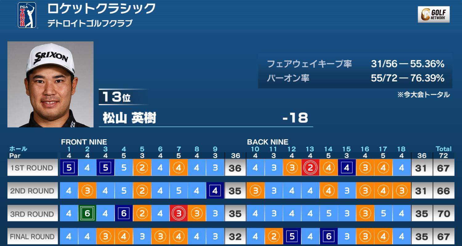 米男子ツアーのロケットクラシックは29日、ミシガン州のデトロイトゴルフクラブ ノースコース(7,370ヤード・パー72)で最終ラウンドが行われ、松山英樹は7バーディ、2ボギーの「67」で回り、通算18アンダー13位タイとなった。