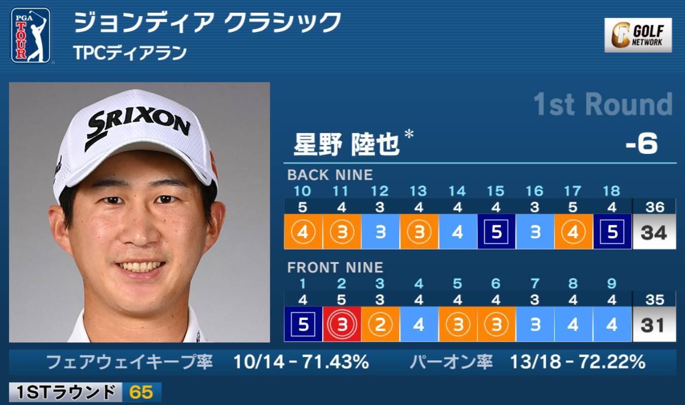 米男子ツアーのジョンディアクラシックは3日、イリノイ州のTPCディアラン(7,289ヤード・パー71)で第1ラウンドが行われ、星野陸也が1イーグル、7バーディ、3ボギーの「65」で回り、6アンダー8位タイ発進となった。