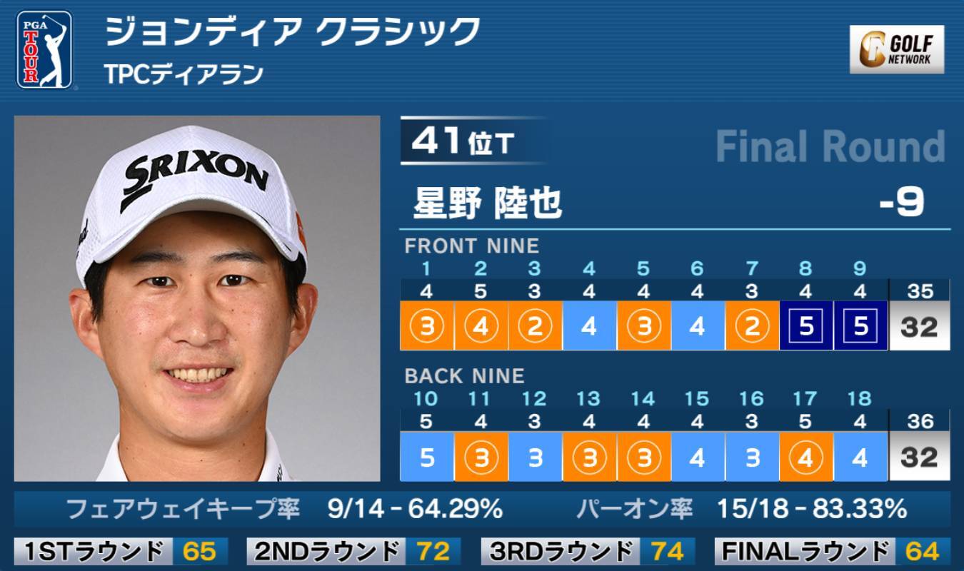 米男子ツアーのジョンディアクラシックは6日、イリノイ州のTPCディアラン(7,289ヤード・パー71)で最終ラウンドが行われ、星野陸也は出だしから3連続バーディを奪うなど、9バーディ、2ボギーの「64」を叩き出し、通算9アンダー41位タイで終えた。
