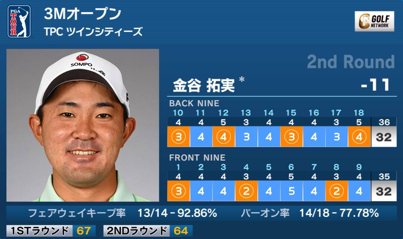 米男子ツアーの3Mオープンは25日、米ミネソタ州のTPCツインシティーズ(7,431ヤード・パー71)で第2ラウンドが行われ、35位タイから出た金谷拓実が7バーディ、ノーボギーの「64」を叩き出し、通算11アンダー5位タイに浮上した。