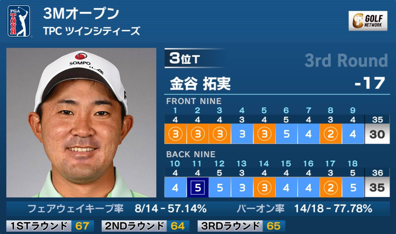 米男子ツアーの3Mオープンは26日、米ミネソタ州のTPCツインシティーズ(7,431ヤード・パー71)で第3ラウンドが行われ、3打差5位タイから出た金谷拓実は7バーディ、1ボギーの「65」をマークし、トップと1打差の通算17アンダー3位タイで最終日を迎える。