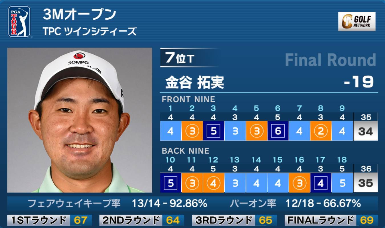 米男子ツアーの3Mオープンは27日、米ミネソタ州のTPCツインシティーズ(7,431ヤード・パー71)で最終ラウンドが行われ、1打差3位タイから出た金谷拓実は6バーディ、4バーディの「69」で回り、通算19アンダー7位タイに入った。
