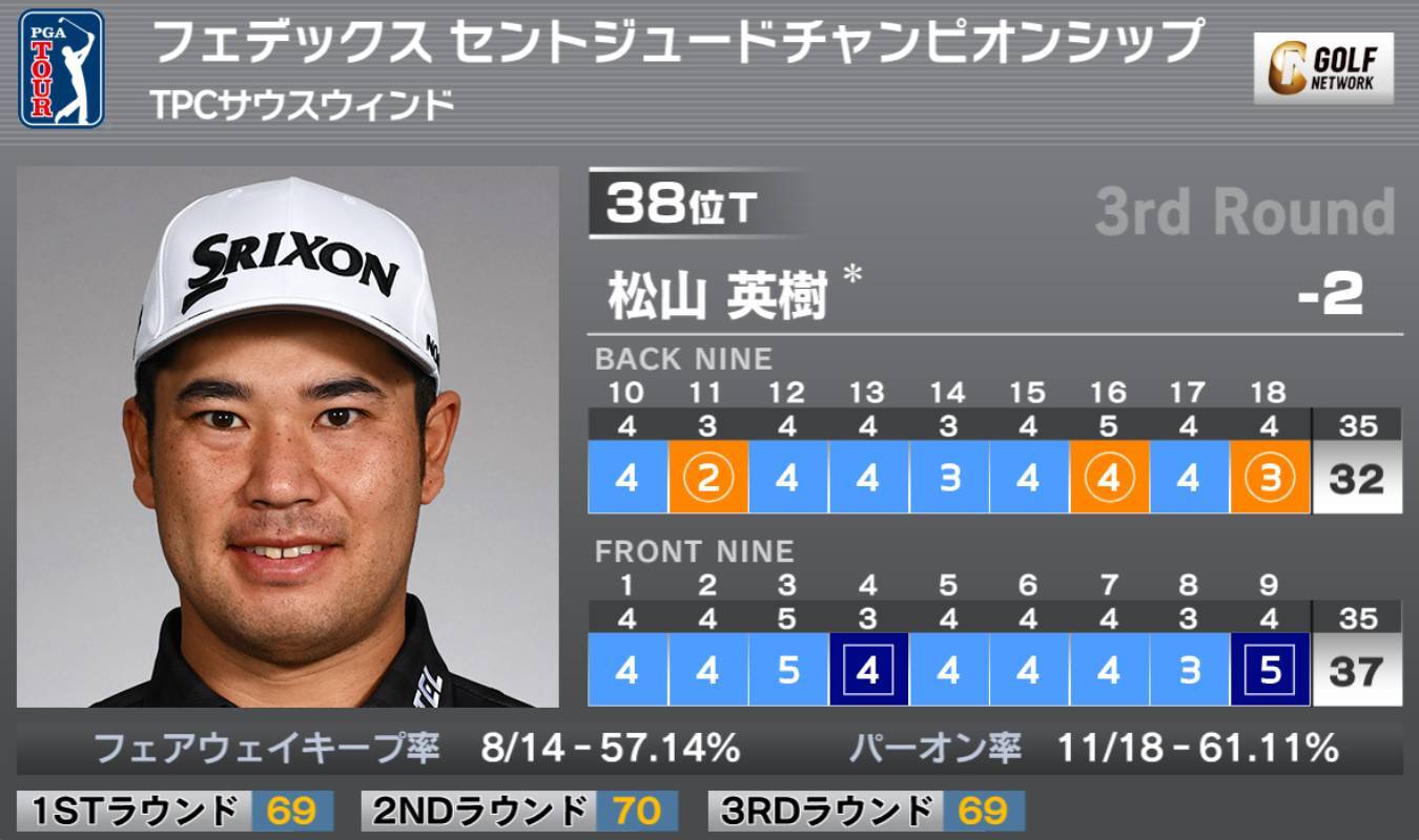 米男子ツアーのフェデックスセントジュードチャンピオンシップは9日、米テネシー州のTPCサウスウィンド(7,288ヤード・パー70)で順延となっていた第2ラウンドの続きと第3ラウンドが終了。昨年覇者の松山英樹は第2ラウンド「70」、第3ラウンド「69」で通算2アンダーとし、38位タイで最終日を迎える。