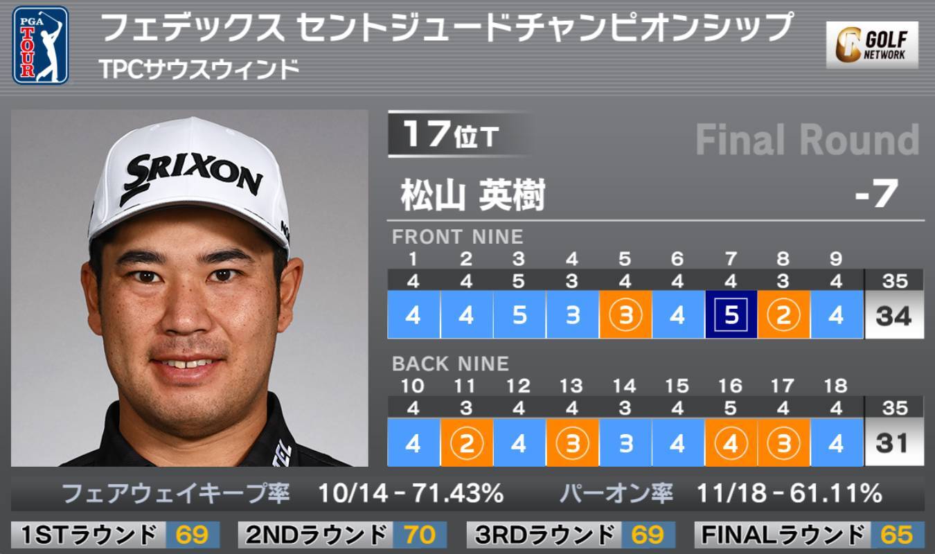 米男子ツアーのフェデックスセントジュードチャンピオンシップは10日、米テネシー州のTPCサウスウィンド(7,288ヤード・パー70)で最終ラウンドが行われ、昨年覇者の松山英樹は6バーディ、1ボギーの「65」で回り、通算7アンダー17位タイ。ポイントランク上位50人が争うプレーオフシリーズ第2戦のBMWチャンピオンシップに21位で進む。
