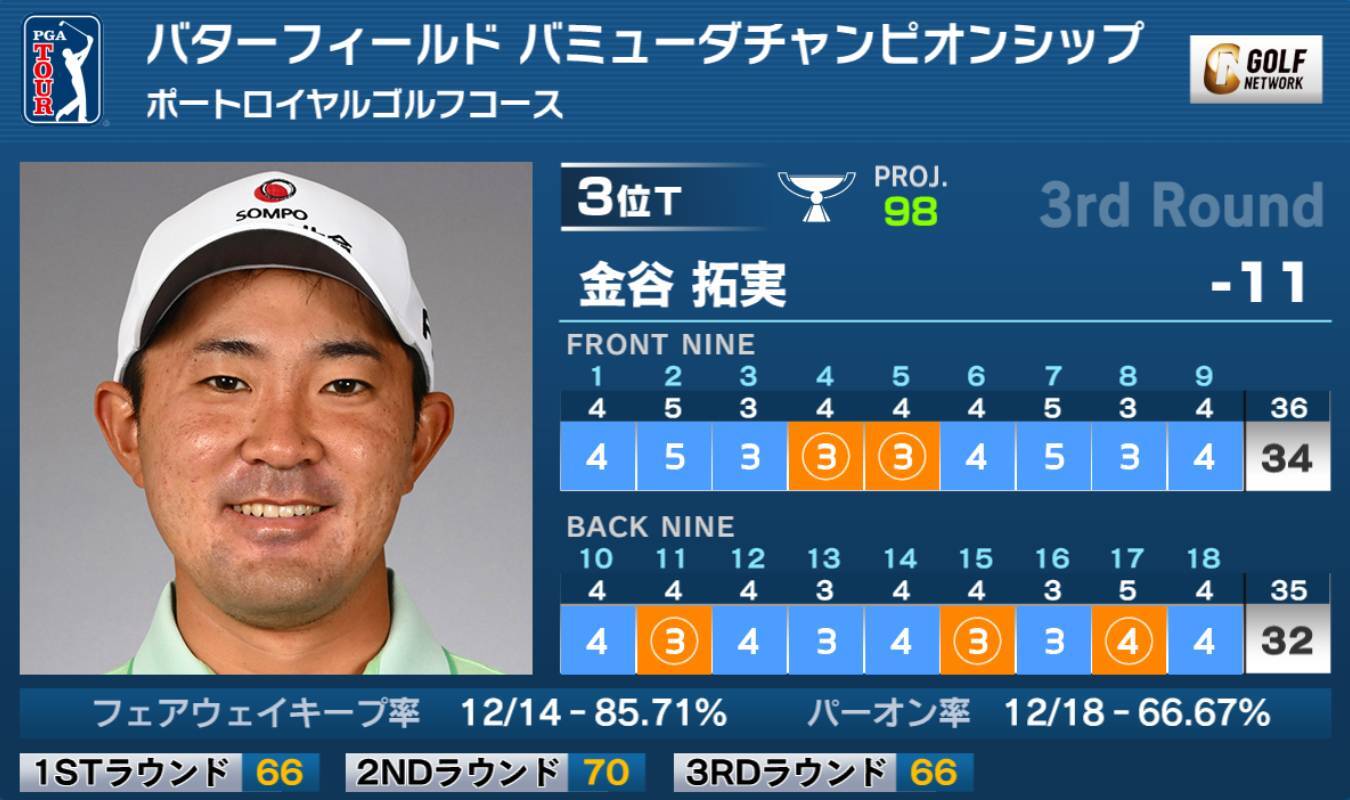 米男子ツアーのバターフィールドバミューダチャンピオンシップは15日、バミューダ諸島のポートロイヤルゴルフコース(6,828ヤード・パー71)で日没順延となっていた第2ラウンドの残りと第3ラウンドが行われ、9位タイから出た金谷拓実は5バーディ、ノーボギーの「66」で回り、首位と1打差の通算11アンダー3位タイに浮上。ポイントランク120位で今大会を迎えたが、3日目終了時点の暫定ランクは98位となっている。