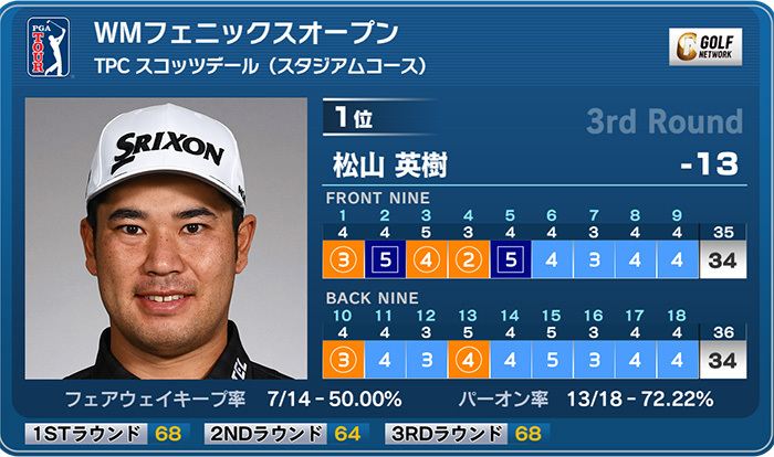 米男子ツアーのWMフェニックスオープンは7日、アリゾナ州のTPCスコッツデール(7,261ヤード・パー71)で第3ラウンドが行われ、1打差単独2位から出た松山英樹は5バーディ、2ボギーの「68」をマーク。通算13アンダー単独首位に浮上し、昨年1月のザ・セントリー以来のツアー通算12勝目に王手をかけた。