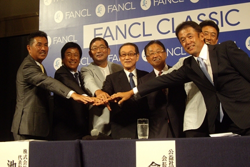 ?シニアツアーの「ファンケル クラシック」(賞金総額7,200万円、優勝賞金1,500万円)が今年も8月19日から3日間、静岡県裾野市の裾野カンツリー倶楽部で開催されるが、本大会を前に4日、都内ホテルで行われた記者発表会に、日本プロゴルフ協会会長の倉本昌弘(60)、中嶋常幸(61)、湯原信光(58)、水巻善典(57)、芹澤信雄(56)、鈴木亨(50)らが出席した。