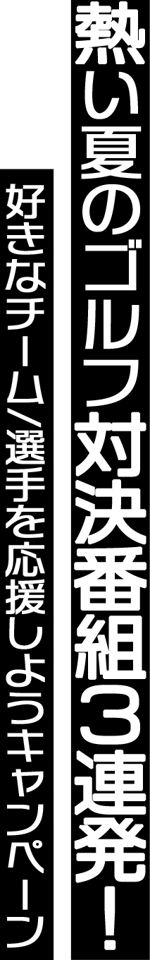 対決番組3連発で好きなチームを応援!「サンドウィッチマン伊達とナイツショット!」では、伊達今江の楽天対ナイツデーブの巨人がゴルフ交流戦!レジェンド倉本昌弘と尾崎直道がチームバトル「スケッチャーズ スリップインズゴルフ倶楽部」ヒロミ、ココリコ遠藤らゴルフ自慢の芸能人が集結!注目の新番組 激突ホールマッチ「SHOWDOWN」では、選手会長 谷原秀人vs副会長 阿久津未来也が本気勝負!